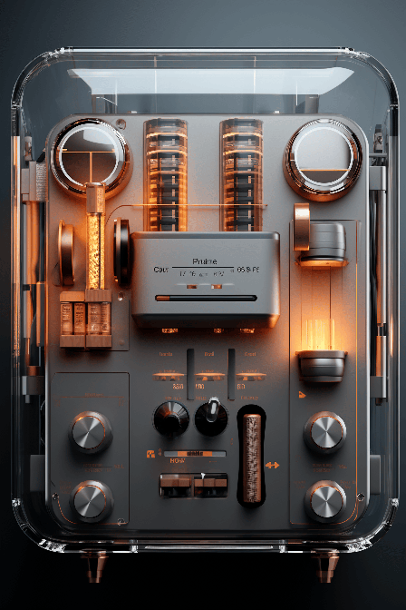 Visualize a concept by Frame Magazine. A futuristic, transparent audio interface that showcases creativity and innovation. The style combines modern minimalism with Futurism. Render it in 3D, in a high-end design studio under studio light. Capture the super detail in UHD, 16K resolution. --ar 2:3 --s 250 --style raw --v 6.0