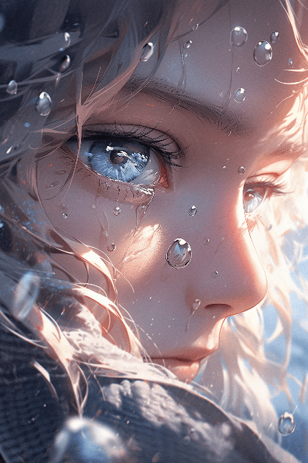 Full body illustration, Digital illustration, crying woman, tear in her eyes, shiny thick long hair, clear blue eyes, freckles on face, sunlight Reflecting tears, big reflecting eyes, filled with tears, sad expression, in the style of futuristic realism, sad expression, liquid, water, transparent, speedpainting, costume, pop kei, cartoon realism, realistic sunlight, random angle --ar 2:3 --s 400 --niji 5