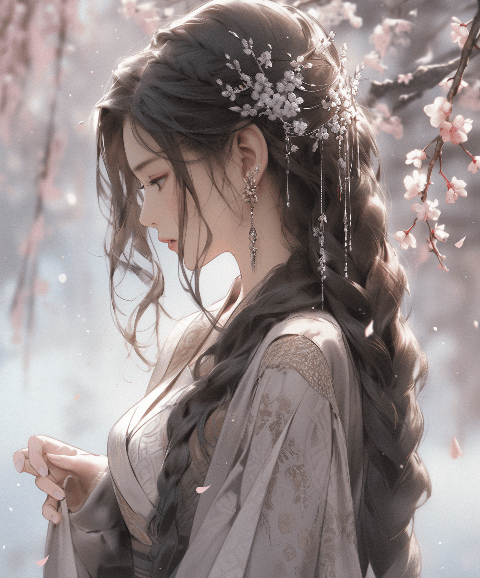 A beautiful Chinese woman, under the cherry blossom tree, adorned with a delicate Hanfu, her elegant posture captured in profile view, cascading waterfall in the background, the scene radiates serenity. Rendered in UHD 8K with the charm of anime style, the artist taking inspiration from Zhang Jingna's mastery of fine details --ar 4:5 --s 400 --niji 5