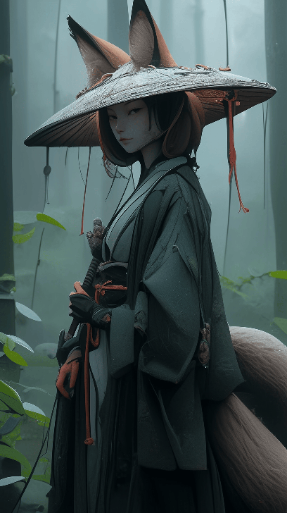 In Japanese retro style, a warrior woman with a fox mask makes her way through a dense, ethereal forest. Close-up shot shows her determination. The environment is a mystical woodland veiled in morning fog. Artist: Albert Watson --ar 9:16 --style expressive --s 400 --niji 5
