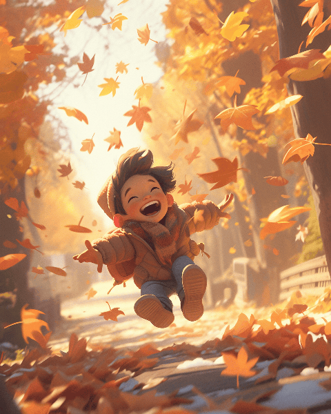 Imagine in 3D model art style, a child jumping into a pile of autumn leaves. The extreme close-up perspective captures the child's joy and the leaves mid-flight. The environment is a backyard during fall. Rendered in Unreal Engine 5. Artist: Aline Smithson --ar 4:5 --s 400 --niji 5