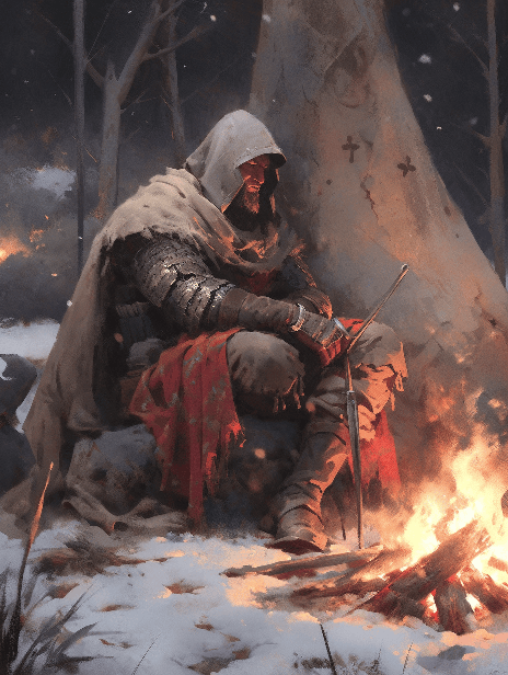 A noble knight, his ruggedly handsome face lit by the dying embers of a fire, contemplates his journey. The perspective is a close-up, the composition capturing the silent contemplation of the warrior. His environment, a moonlit medieval encampment, invokes the captivating imagery found in National Geographic. Rendered in a fusion of flat design and --s 400 --niji 5