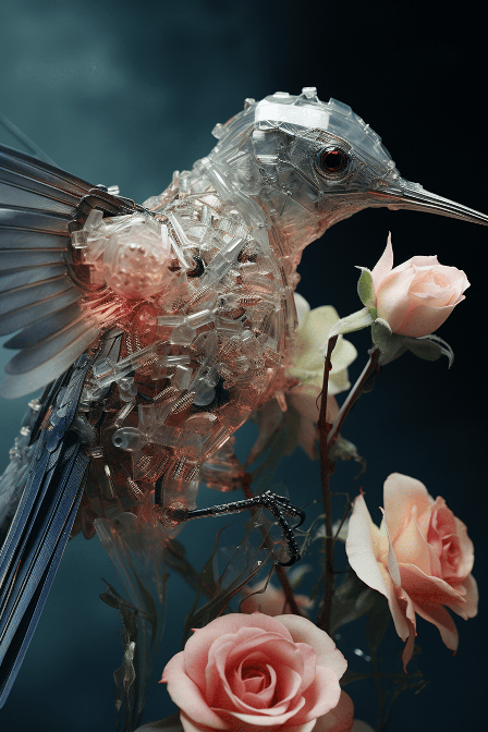 Venture into a future where hummingbirds with metallic wings flit around a garden of digital roses The close-up view captures the delicate beauty of these cybernetic creatures, lending a cinematic quality to the scene by Tim Walker --ar 2:3 --s 250 --style raw --v 6.0