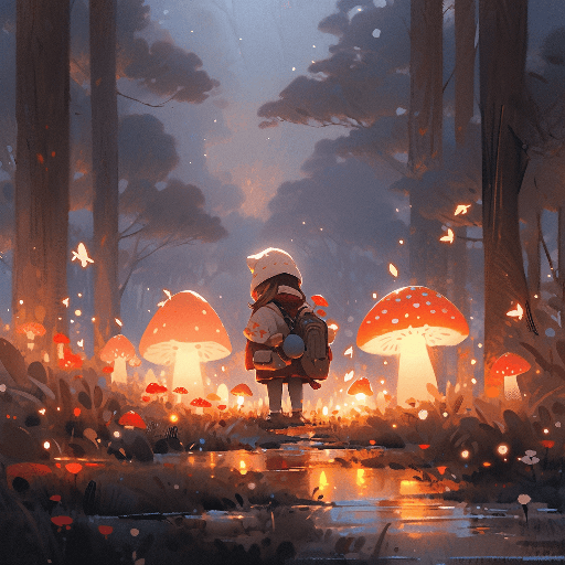 Picture a scene in the cartoon style, a child with a glowing lantern ventures into a forest filled with glowing mushrooms and twinkling will-o-wisps. Extreme wide-angle shot captures this enchanting scene. Artist: Alessandra Sanguinetti --ar 1:1 --s 400 --niji 5