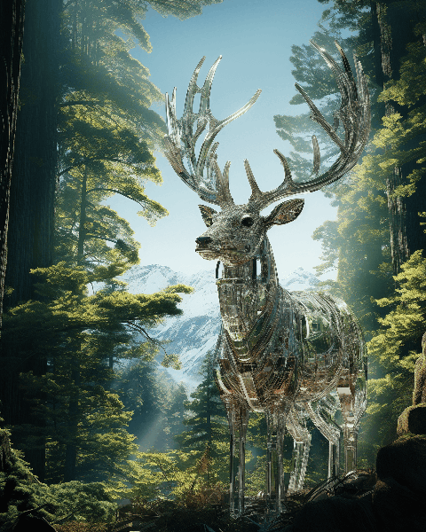 Envision a world where mechanical deer roam a digital forest, their forms crafted from polished chrome The low angle view captures this unusual blend of nature and technology, rendered in hyper-detailed, cinematic style by Ansel Adams --ar 4:5 --s 250 --style raw --v 6.0