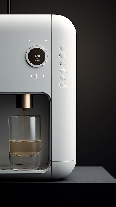 Imagine a minimalist coffee machine with design aesthetics reminiscent of Dieter Rams's functionalist approach. The appliance is rendered in 3D with a soft matte finish, showcasing its clean lines and elegant form. Its minimalist control panel and sleek body are highlighted under a professional studio light setup, captured in high-resolution detail for a potential feature in an issue of Wallpaper magazine --ar 9:16 --s 250 --style raw --v 6.0