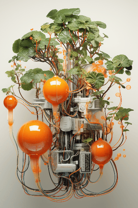 An orange plant is displayed with wires and, in the style of toycore, concert poster, mike campau, loose and fluid forms, chris labrooy, clamp, y2k aesthetic --ar 2:3 --style raw --s 250 --v 6.0