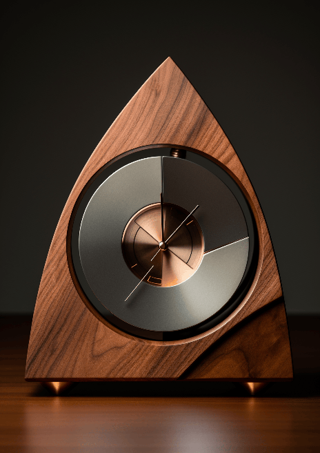 Imagine a beautifully designed tabletop clock, reminiscent of mid-century modern design. Rendered in ultra-high definition, the clock is an elegant mix of brass and walnut, its sculptural form casting intriguing shadows under the soft studio lighting. The clock's geometric face contrasts with its fluid, sculptural body, making it a standout piece in any setting --ar 5:7 --s 250 --style raw --v 6.0