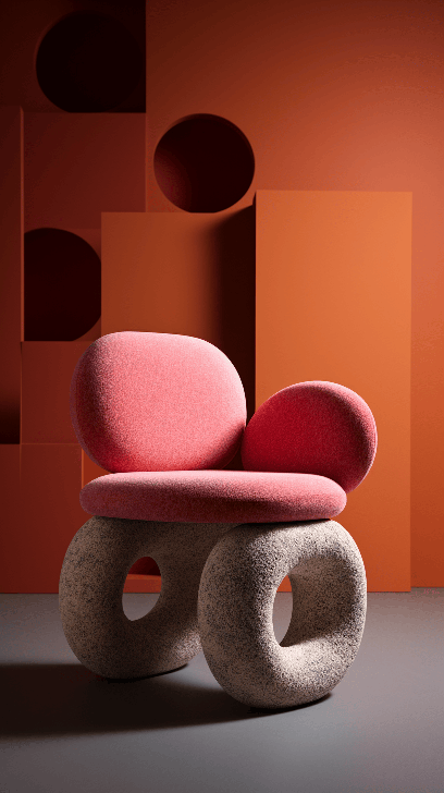 Visualize a uniquely shaped chair that seamlessly integrates the playful creativity of Memphis design and the organic shapes of Japanese Wabi-Sabi aesthetics. The chair, rendered in 3D, boasts a geometric form, its texture-rich upholstery playing with light and shadow under the studio lighting. The image, showcasing the chair in a high-end design setup, presents every nuance of the design in stunning ultra detail --ar 9:16 --s 250 --style raw --v 6.0