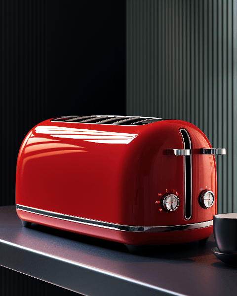 Picture a minimalist style toaster, borrowing from the sculptural precision of Arne Jacobsen's designs. The main elements are the sleek metal body and the contrasting black control dials, with an auxiliary element of the red-hot heating coils inside. The environment is a stylish, modern kitchen with a monochrome color scheme, as seen on dribbble --ar 4:5 --s 250 --v 6.0