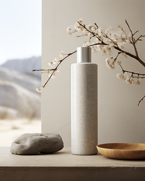 Visualize a skin care product, bathed in the subtle elegance of Japanese Wabi-Sabi aesthetics. The product bottle, sculpted with fluid forms and a texture reminiscent of nature, sits quietly against a simple, minimalist background. Captured in a high-resolution rendering, the image reveals the imperfections of its design, akin to the organic irregularities found in nature. The aesthetic elements of the product, combined with ultra details and natural light, evoke a sense of tranquility and harmony --ar 4:5 --s 250 --style raw --v 6.0