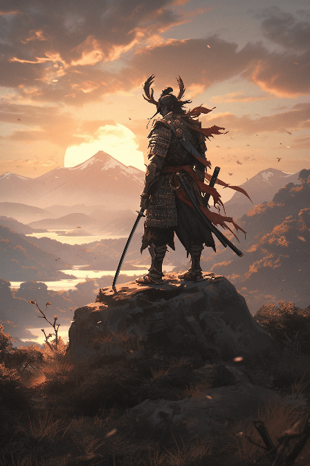 A vibrant 3D model art representation of a lone samurai standing on a serene mountain peak, bathed in the golden light of a setting sun. The samurai, adorned in majestic armor, exudes courage and determination. He surveys the land below, his face showing both resolve and peace. Consider a close-up shot to capture the fine details on his face and armor. The scene unfolds in a breathtaking mountainous landscape, much like those seen in National Geographic, with cherry blossoms adding a dash of color to the scene. Render this image in UHD, 8k for the finest details, and in the style of Albert Watson. --ar 2:3 --s 400 --niji 5
