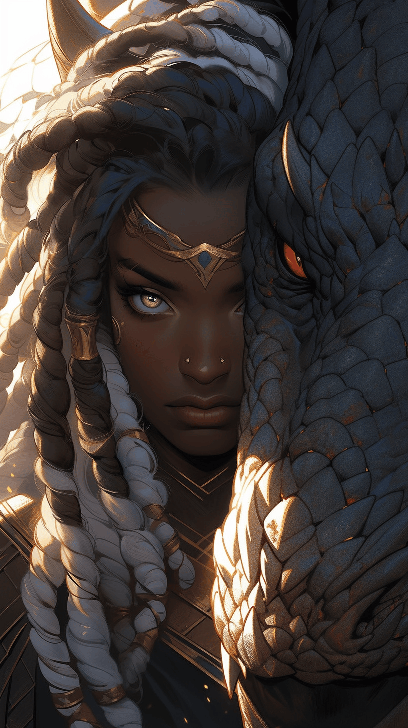 A fierce warrior woman stands, her face showing her resolve. From her strong jawline to her piercing eyes, every detail of her face speaks of her courage and power. Behind her, an enormous dragon rises, its scales glinting in the sunlight. This close-up shot uses a wide angle composition, creating a sense of enormity and drama. Rendered in the style of a 3D model art by Alessandra Sanguinetti, it includes ultra-high-definition details and an 8K resolution. --ar 9:16 --s 180 --v 6.0