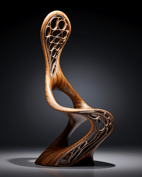 Envision a uniquely shaped chair, inspired by the organic forms of nature. Rendered with stunning detail in ultra-high definition, the chair is a visual symphony of wood grains, knots, and natural imperfections. Its sculptural precision, combined with the warmth of studio lighting, gives it a mesmerizingly real appearance, ideal for a high-end design catalogue --ar 4:5 --s 250 --style raw --v 6.0