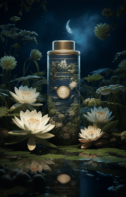 A skin care product featured on Instagram, depicted as a serene moonlit lake, surrounded by blooming water lilies and willow trees in a peaceful garden --ar 9:14 --s 250 --v 6.0