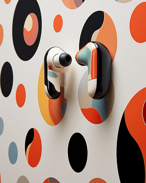 A pair of levitating wireless earbuds set against an abstract painted canvas background. The earbuds' sleek form contrasts with the textured backdrop in a composition influenced by Yayoi Kusama's bold, repetitive patterns --ar 4:5 --s 250 --v 6.0