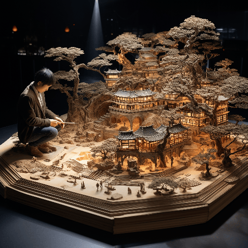 Imagine a work by Xu Bing. A library where the books open to reveal not pages, but detailed miniature landscapes. This 3D art scene, rendered in ultra-detailed 16K, creates a visual paradox between the familiar and fantastical. The high-angle shot accentuates the sense of immersion and discovery. --ar 1:1 --s 250 --style raw --v 6.0