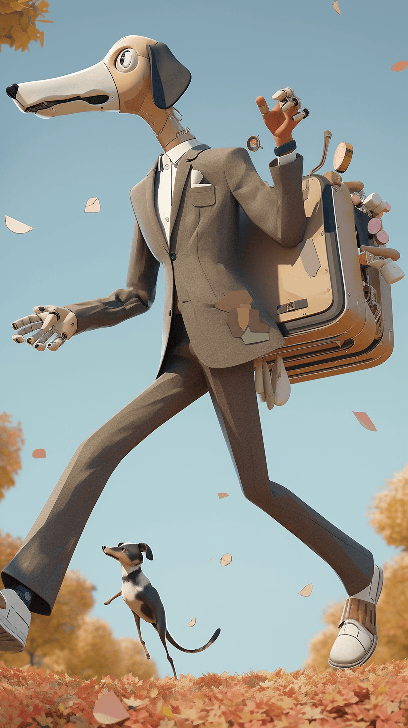 A fantastic 3D art scene depicts a fashionable gentleman, dressed by Louis Vuitton, walking a high-tech robotic dog in a city park. This half body shot captures a dynamic moment as the dog playfully leaps up. The fisheye lens composition, by Elina Brotherus, gives a whimsical perspective, distorting the cityscape into a circular backdrop. Main elements are the man, the dog, and the park scenery, detailed in 16K --ar 9:16 --style expressive --s 180 --v 6.0