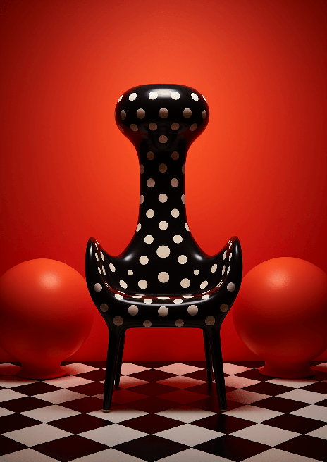 Picture a designer lamp, with a fluid form, floating in a monochromatic, dream-like space. The image borrows from Yayoi Kusama's love for polka dots, incorporating them subtly into the lamp's design. --ar 5:7 --s 250 --v 6.0