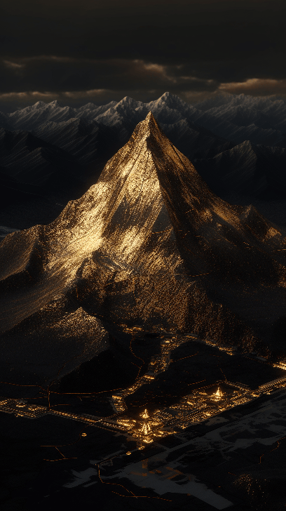 A Crest of a Mountain with a Structure atop of it, massive in scope does not look human made, maybe a city of Gold, complex structure,With a black background ,ultra-detailed,C4D,octane rendering,Blender,8K,HD,hyper detailed, hyper realistic, photorealistic,cinematic, HDR, unreal engine 5,hyper realistic, photorealistic --ar 9:16 --style raw --v 6.0