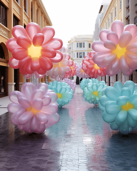 Pastel colors, inflated plastic flowers, installation, city center --ar 4:5 --style raw --v 6.0