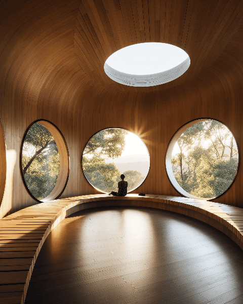Meditation room with wooden lambrín finishes, circular walls with a wooden finish and circular windows --ar 4:5 --style raw --v 6.0