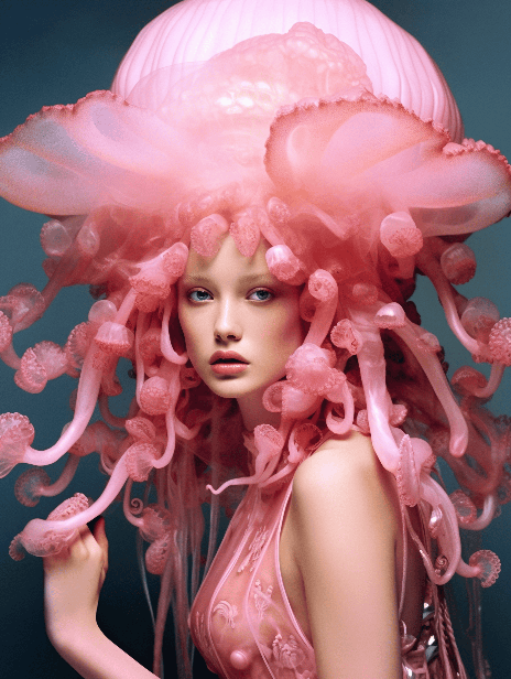Beautiful vivid pink jellyfish goddess with one hand On her cheek By James Christensen, foto Mario Testino --ar 3:4 --style raw --v 6.0