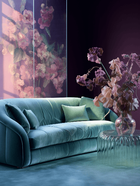 Mert and Marcus modern retro glass elegant sofa, jewel tone silks and bottle green walls, light of drama, cinematic atmosphere, Tim walker modern glass chair in a room of painted glass walls like floral water colours or Chinese, light of drama, dark image, translucent light, glass glints, cinematic atmosphere, pale pinks and baby blues, lilac 8k, --ar 3:4 --style raw --v 6.0
