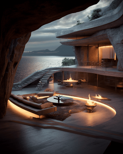 Wide shot of big luxurious futurist living room and kitchen of concrete 3d printed house on top of the cliff, sunken fire pit, interior design awarded, modern led lights, , detailed texture, view of a concrete 3d printed mid - century modern art design studio designed by peter zumptor, japandi style, sitting on a rocky cliff next to the ocean, neo concrete trtends, futuristic, bright neat textured walls and architectrural awarded design, design elements, pop art on walls, Modern graphic art studio space, and clay brass marble steel, abstract art, warm light fixtures, cosy indirect warm light inside, sunny day, extremely detailed, intricate details, film photography by Julius Shulman --ar 4:5 --style raw --v 6.0
