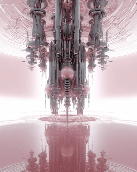 A submerged cyberpunk laboratory, a machine pierces the veil between dimensions, allwoing a fractal spike to jut out of the rift, photorealistic, ominous, intricate lighting, white background, white and pink, hd, 8k --ar 4:5 --style raw --v 6.0