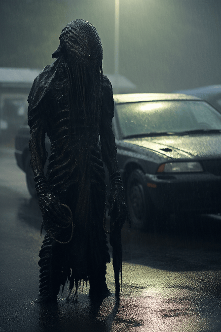 A hairy alien xenomorph dressed as a demonic necromancer, in a car park, smells of evil, eerie atmosphere, in the jungle, light mist, full figure, beautiful lighting, photorealism, photograph, emerging from darkness , very highly detailed photo, heavy rain , soft lighting, dark setting, dramatic scene, 50mm hasselblad --ar 2:3 --upbeta --style raw --v 6.0