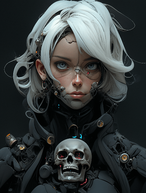 Portrait, Looking at the camera, symmetrical asymmetry, girl, Vector drawing of Cyberpunk machine skull,humanoid machine,ArtStation,hard surface, photo realistic, beautiful lighting, insanely detailed, intricate, hypermaximalist, hyper realistic, no noise, portrait, Cinematic, Color Grading, Editorial Photography, Photography, Photoshoot, Ultra-Wide Angle, Depth of Field, DOF, Shutter Speed 1/1000, F/22, Gamma, White Balance, Neon, Light, Dark, Light Mode, Dark Mode, High Contrast, 5D, Multiverse, 32k, Super-Resolution, Megapixel, ProPhoto RGB, VR, Lonely, Good, Massive, Big, Spotlight, Frontlight, Halfrear Lighting, Backlight, Rim Lights, Rim Lighting, Artificial Lighting, Natural Lighting, Incandescent, Optical Fiber, Moody Lighting, Cinematic Lighting, Studio Lighting, Soft Lighting, Hard Lighting, volumetric Light, Volumetric Lighting, Volumetric, Contre-Jour, Rembrandt Lighting, Split Lighting, Beautiful Lighting, Accent Lighting, Global Illumination, Lumen Global Illumination, Screen Space Global Illumination, Ray Tracing Global Illumination, Optics, Materiality, Ambient Occlusion, Scattering, Glowing, Shadows, Rough, Shimmering, Ray Tracing Reflections, Lumen Reflections, Screen Space Reflections, Diffraction Grading, Chromatic Aberration, GB Displacement, Scan Lines, Ray Traced, Ray Tracing Ambient Occlusion, Anti-Aliasing, FXAA, TXAA, RTX, SSAO, Shaders, OpenGL-Shaders, GLSL-Shaders, Post Processing, Post-Production, Cel Shading, Tone Mapping, CGI, VFX, SFX, insanely detailed and intricate, hypermaximalist, elegant, hyper realistic, super detailed, photography, 8k, HDR, Unreal Engine 5, Octane Render, Cinestill 800T, sharp focus, Redshift Render --ar 9:12 --niji 5 --s 180 --style expressive