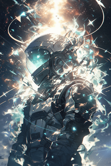 An astronaut floats weightlessly in space, Earth glowing behind him. His visor reflects blue and green swirls of the Milky Way galaxies ahead. Stars sparkle all around, illuminating the intricate details of his white space suit. A sense of wonder and exploration, cinematic lighting, high resolution --ar 2:3 --s 400 --niji 5