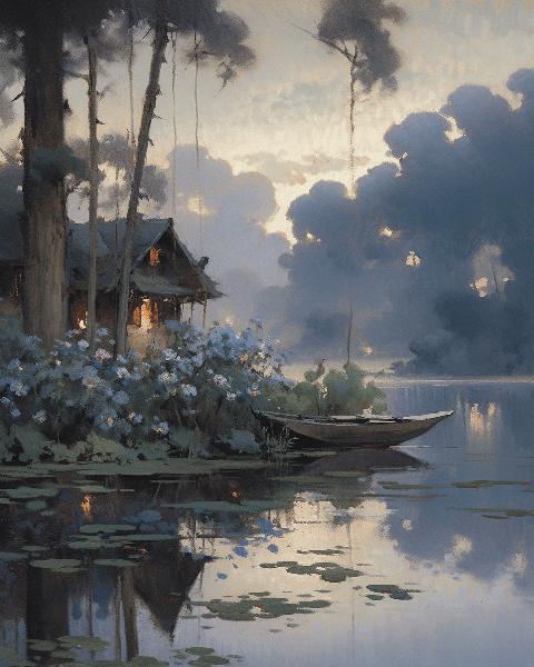 A beautifully tranquil scene in the style of Claude Monet, a fisherman's hut is nestled beside a pristine lake under a twilight sky. The setting exudes a serene vibe in the extreme close-up, with its meticulous brushwork details. The composition's long shot mirrors the peaceful and expansive environment, reminiscent of untouched landscapes in National Geographic, captured in 8K for the utmost detail. --ar 4:5 --s 400 --niji 5