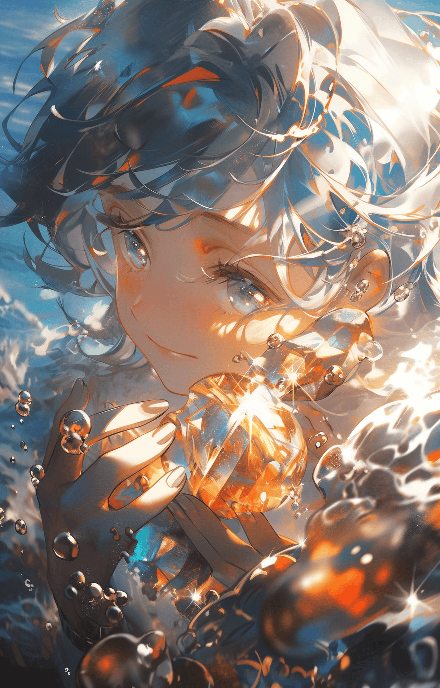 In the style of anime, a young pearl diver surfaces, treasure in hand. The close-up shot captures her triumph and the sparkling ocean surface behind her. UHD and 8K resolution. Artist: Alex Strohl --ar 9:14 --s 400 --niji 5