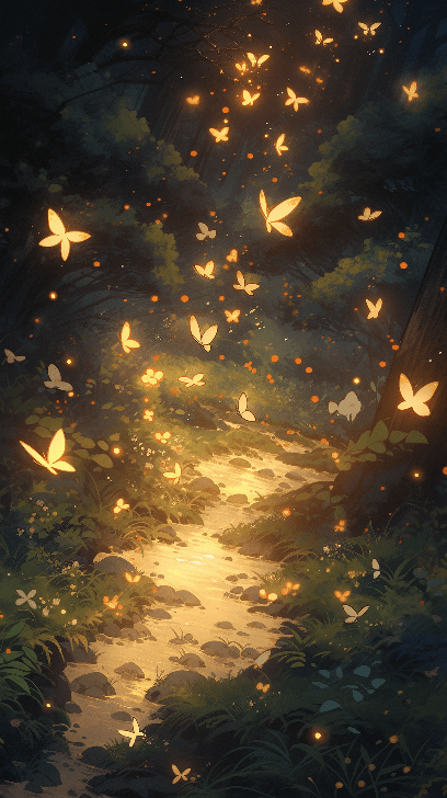 Venture into a shadowy thicket, where luminous fireflies dance in the anime style. A close-up captures their ethereal glow, creating a composition full of mystery and charm, akin to Chema Madoz's surrealistic visions. Rendered in octane for a hyper-detailed spectacle. --ar 9:16 --s 400 --niji 5
