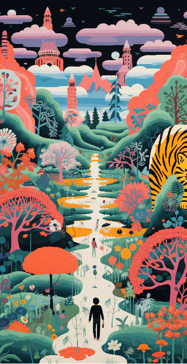 Person and tiger walking side by side, Surrounded by a fantastical landscape with vibrant colors and oversized plants, A sense of wonder and adventure, Dream - like and whimsical atmosphere, by michael deforge --ar 1:2 --s 250 --style raw --v 6.0