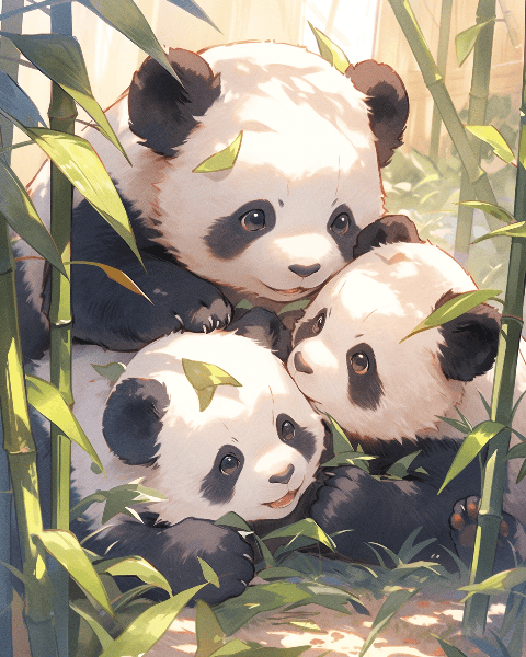 Two adorable fluffy panda cubs playfully tumble together in a sunny bamboo forest glade, warm lighting filtering through the leaves. Detailed fur texturing, peaceful nature mood, gentle lighting. Traditional watercolor style. --ar 4:5 --s 400 --niji 5