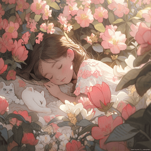 In the style of Hayao Miyazaki, a young girl tending to a garden of luminous, oversized flowers, each one sheltering a sleeping creature of fantasy. Close-up shot capturing the girl's delicate care. Artwork rendered in 8K by Andre Kertesz. --ar 1:1 --s 400 --niji 5
