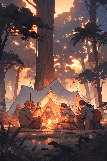 In flat design style, a group of miniature adventurers set up camp under a giant, ancient tree. The environment is a serene forest at dusk. Perspective: wide-angle shot. Artist: Andre Kertesz --ar 2:3 --s 400 --niji 5