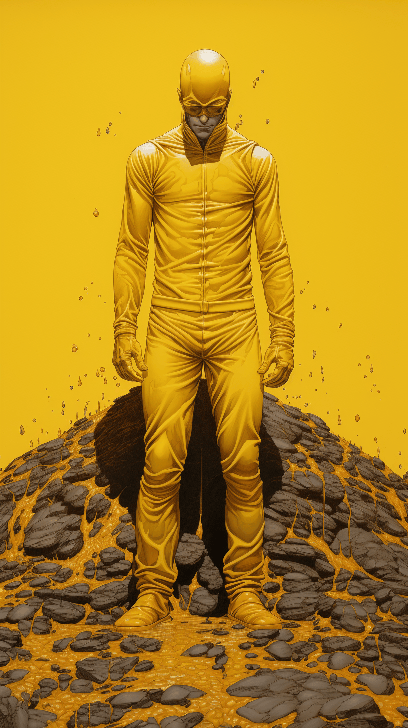 The anime character is on the ground, in the style of light gold and maroon, misha gordin, todd nauck, irreverent humor, yellow and white, layered translucency, tetsuo hara --ar 9:16 --s 250 --style raw --v 6.0