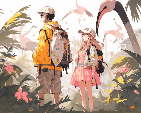 Retro Flat Design, summer, jungle town, bird, couple wearing colorful outfits, lifelike figures, yellow and pink, hikecore, precisionist, ゴーギャン --ar 5:4 --s 400 --niji 5