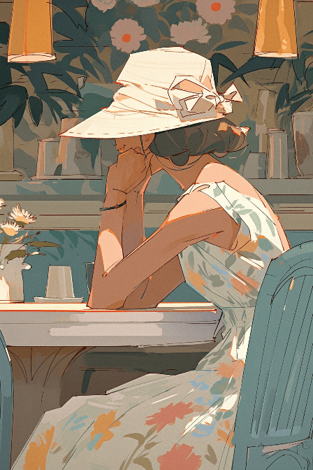 Imagine a tranquil scene in a bustling cafe, drawn in the style of Aline Smithson. A woman with a flower hat sips a cup of tea while floating slightly above her chair. Profile perspective, capturing the surprise and awe of the surrounding patrons --ar 2:3 --style expressive --s 400 --niji 5