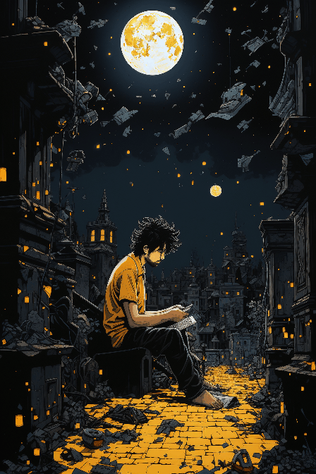 A cartoon with a man getting into the gutter at midnight, in the style of prateep kochabua, yellow, feminine sensibilities, cut/ ripped, meticulous detailing, folk/ naïve: , innovative --ar 2:3 --s 250 --style raw --v 6.0