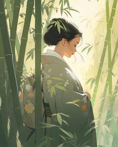Picture a gentle breeze blowing over emerald green bamboo forests. Render this in a Japanese retro style with a profile shot of a lady with an immaculate face, her silk kimono fluttering in the wind, under the warm golden sun filtering through the bamboo leaves --ar 4:5 --s 180 --v 6.0