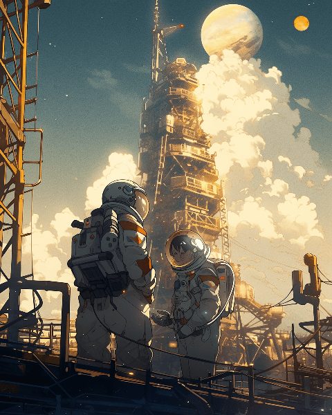 In the Japanese retro style, a lone astronaut is making first contact with a curious alien creature. They exchange a friendly gesture, marking the beginning of a new alliance. Perspective: Close-up. Composition: Golden Ratio. Environment: Alien cityscape in the background. Artist: Alan Schaller --ar 4:5 --s 400 --niji 5