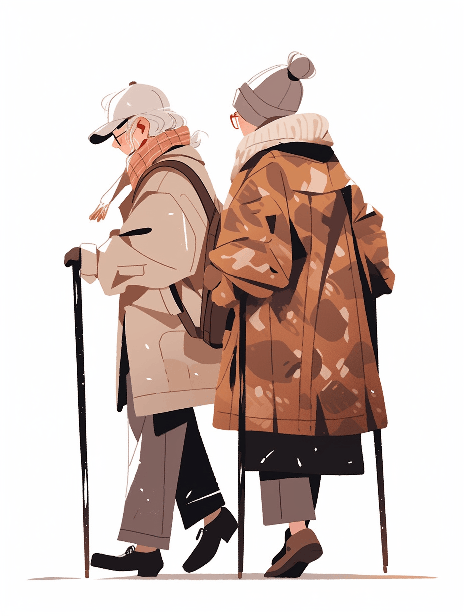 Cartoon image of two elderly people holding a cane and walking stick in close proximity against a white background, flat illustration, minimalist style --ar 3:4 --s 400 --niji 5
