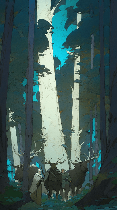 In anime style, a pair of forest guardians, with antlers and leafy capes, watch over the sleeping woodland creatures. The environment is a moonlit forest. Wide-angle shot captures the guardians and the tranquil scene. Artist: Andreas Gursky --ar 9:16 --style expressive --s 400 --niji 5