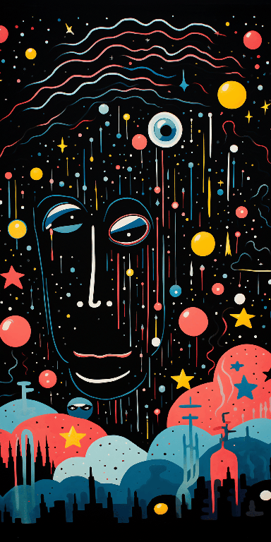 In the vast universe,Under the starry night sky, some one is a night dreamer, in the vast universe, who is a dream maker. Someone is dreamy and beautiful. In the night sky, there are many fish and butterflies and flowers. Grotesque aesthetics,by Michael DeForge. --ar 1:2 --s 250 --style raw --v 6.0