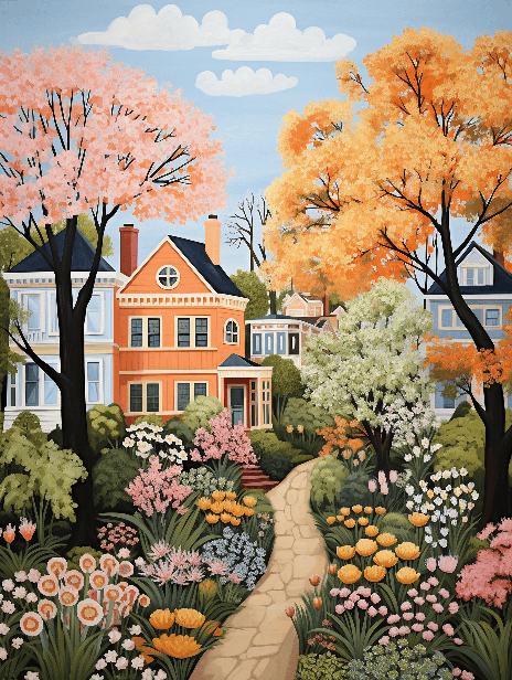 'Auburn trees bloom in front of a house' by person,detailed landscapes, light pink and light orange,by Catherine Nolin, --ar 3:4 --s 250 --style raw --v 6.0